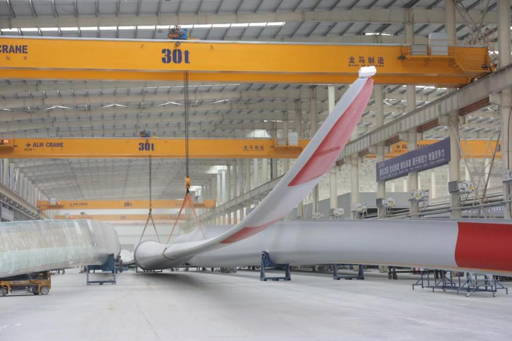 6月20日,东方风电包头基地车间叶片生产现场。新华社 发